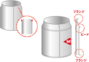 ネッカー・フランジャーとよばれる機械で缶口をしぼって細くし縁を外側に出し、蓋をつけるための肩と、返しをつけます。