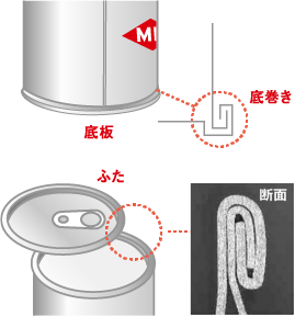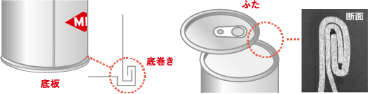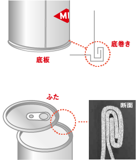 シーマーとよばれる機械で缶胴に缶蓋を被せ密封します。